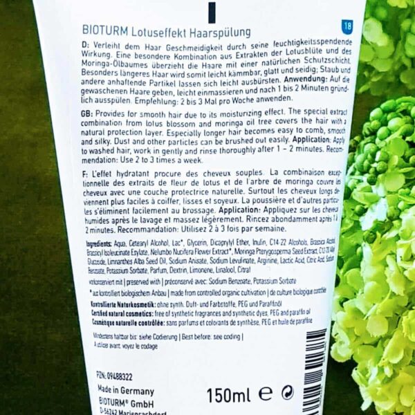 Après le shampoing, appliquez l’après-shampoing cheveux secs Bioturm sur vos cheveux humides. Massez abondamment pendant une à deux minutes puis rincez abondamment. Ce soin capillaire doit être appliqué deux à trois fois par semaine.