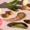 • Poudres de Coques d’Amandes Douces et de Riz : Ces particules naturelles de deux tailles différentes agissent comme des agents exfoliants pour aider à désincruster les impuretés et lisser la peau. La poudre d’amande est issue de l’upcycling.