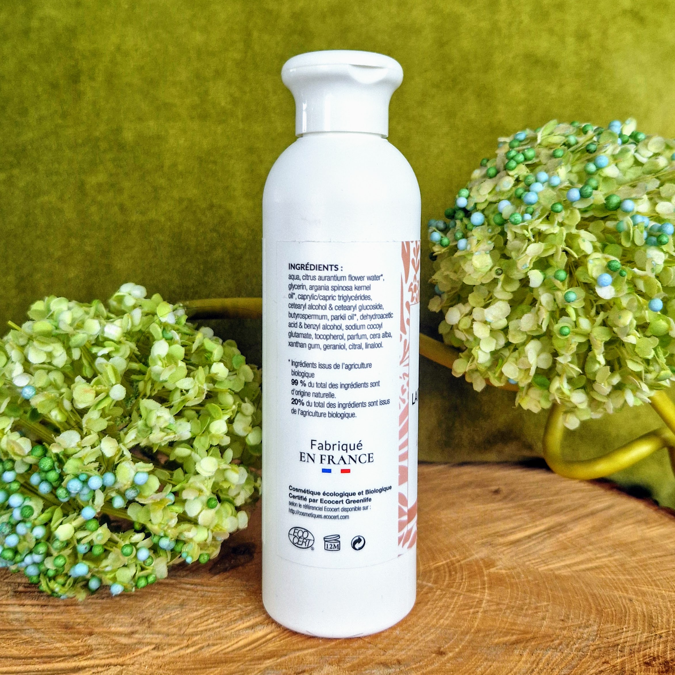 Eau florale de Fleurs d’Oranger bio (13 %) : la fleur d’Oranger rafraichit et apaise l’épiderme tout en lui redonnant de l’éclat.
