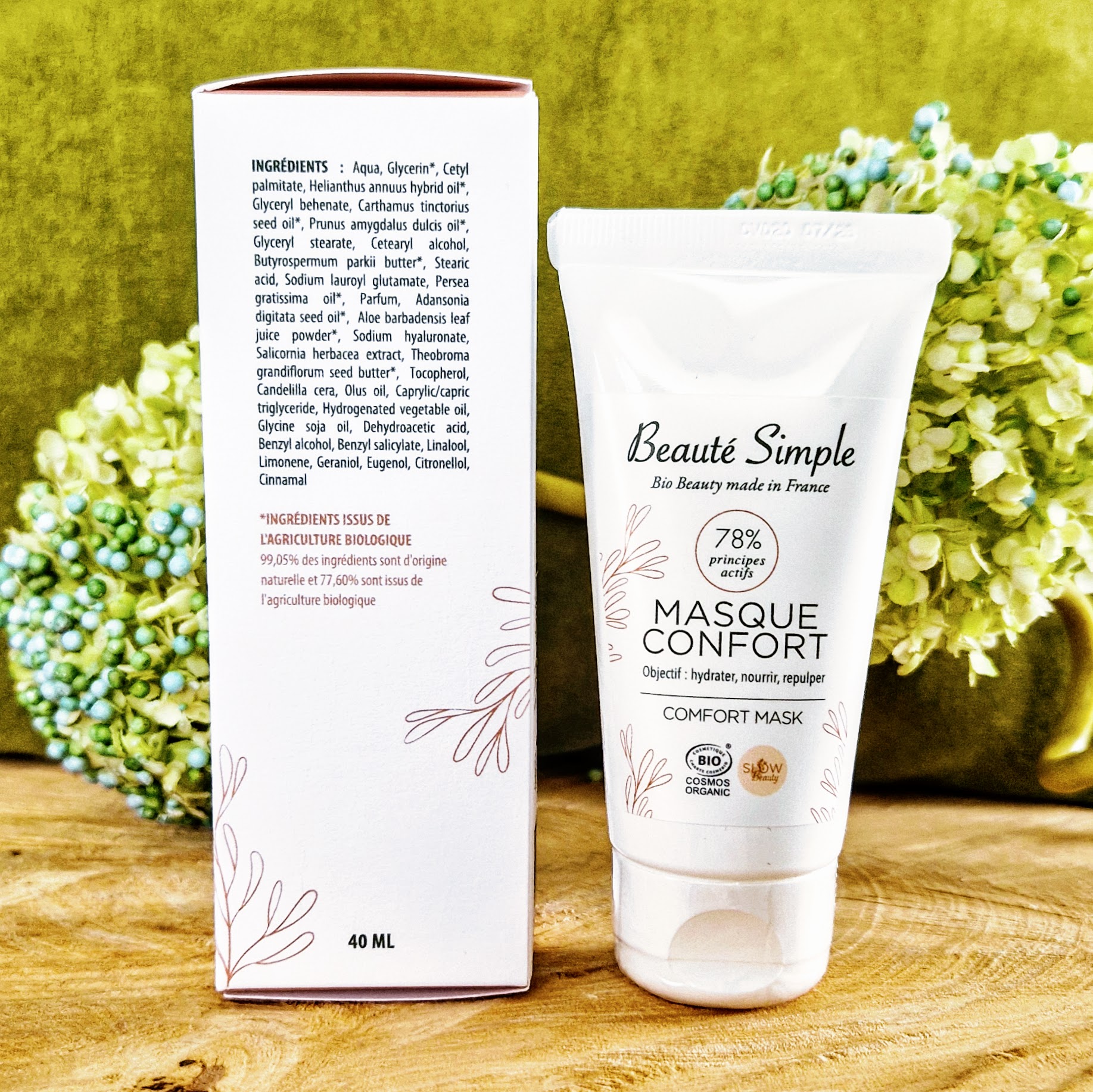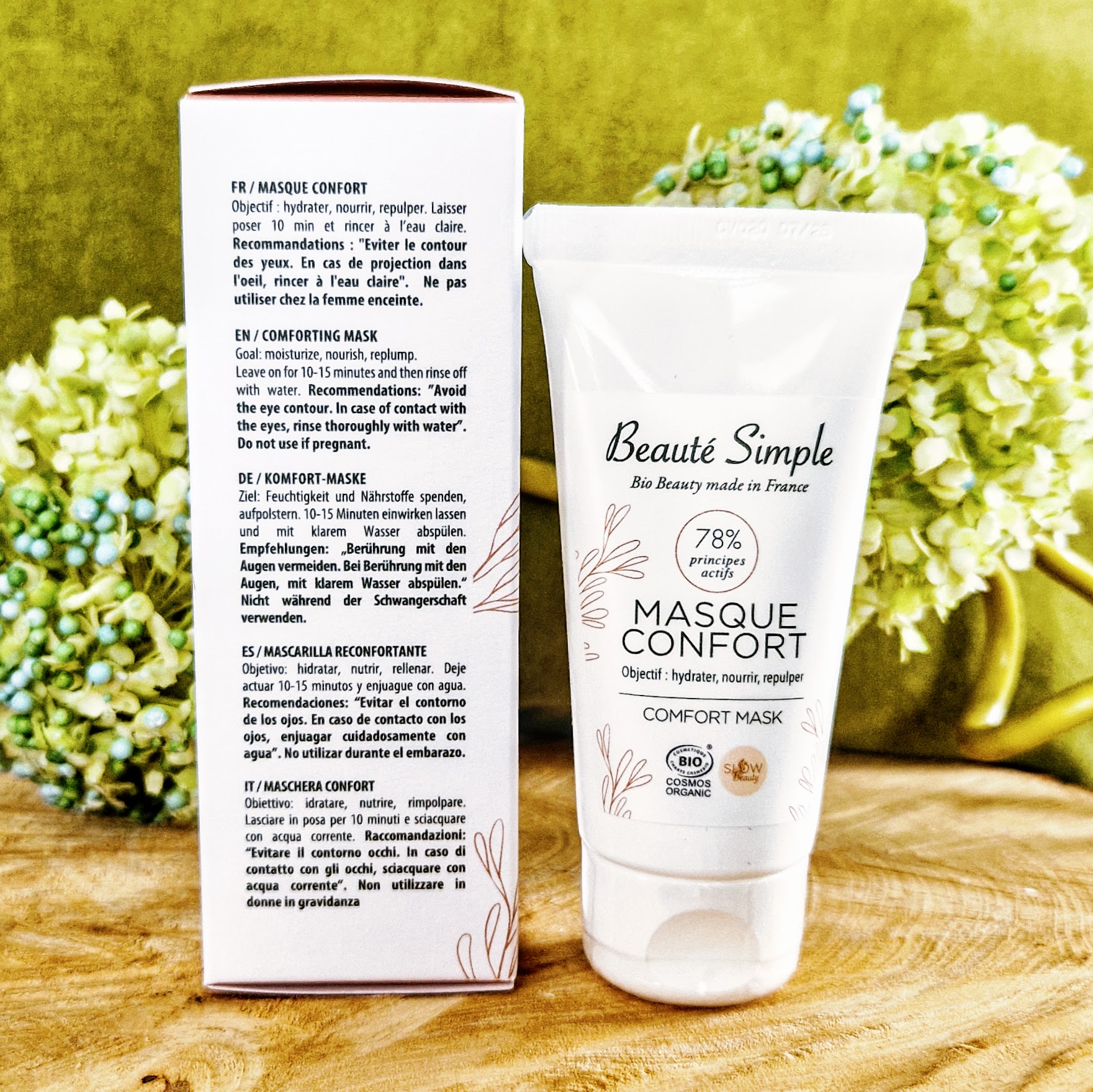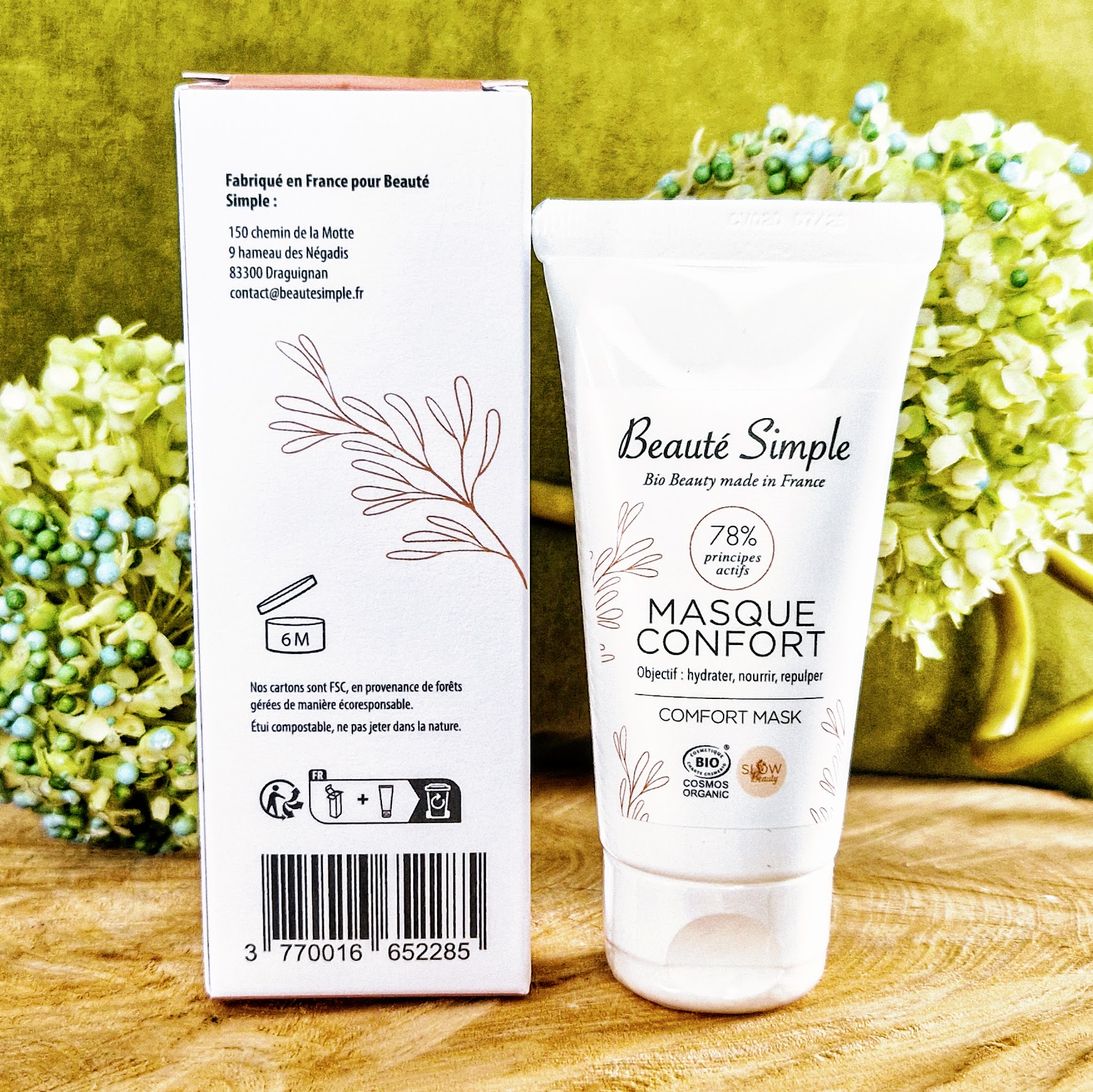 Pourquoi choisir ce produit ? Choisir le Masque Confort Beauté Simple, c’est opter pour un soin qui incarne l’engagement de la marque pour une cosmétique de qualité, made in France et respectueuse. Ce masque est formulé avec 99% d’ingrédients d’origine naturelle dont 78,38% issus de l’Agriculture Biologique. Il est testé sous contrôle dermatologique, assurant une haute tolérance cutanée. Selon des auto-évaluations réalisées sous contrôle médical, 100% des utilisateurs ont trouvé leur peau plus douce et 90,5% ont constaté une meilleure hydratation. Il est également certifié par Bureau Veritas Certification selon le référentiel Cosmos Standard, garantissant ses standards biologiques et naturels. Ses textures fondantes et son parfum agréable procurent un véritable moment de plaisir.