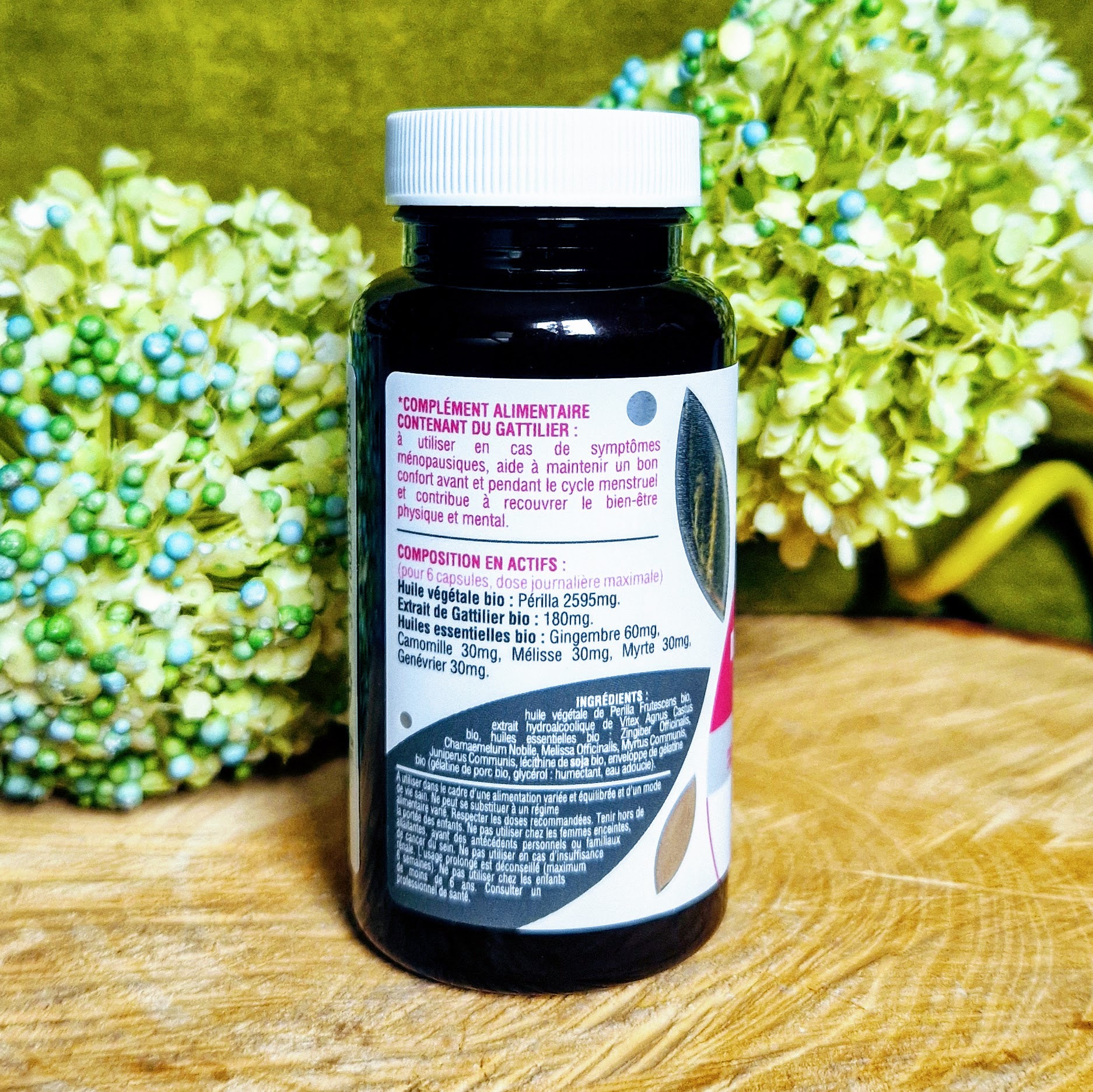 Riche en oméga 3, l’huile de périlla bio offre un acide gras essentiel au bon fonctionnement de l’organisme. L’extrait de gattilier bio est réputé pour sa capacité à veiller au bien-être général avant et pendant le cycle menstruel. L’huile essentielle de gingembre bio est connue pour ses propriétés stimulantes et aphrodisiaques. L’huile essentielle de camomille bio est considérée comme un véritable antistress naturel. Elle manifeste des propriétés relaxantes et pourrait être en mesure de calmer le système nerveux.