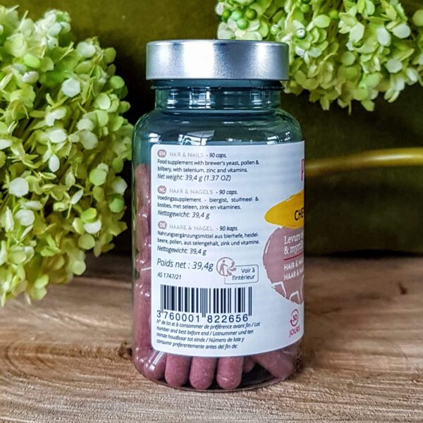 Poudre de Myrtille 378 mg, Pollen 340 mg, Levure de bière 335 mg, L-Selenomethionine 11 mg dont Sélénium 55 µg (100% des AQR*), Citrate de Zinc 7,3 mg dont Zinc 2,25 mg (22,5% des AQR), Vitamine B5 6 mg (100% des AQR), Vitamine B6 1,4 mg (100% des AQR), Vitamine B8 150 µg (300% des AQR).